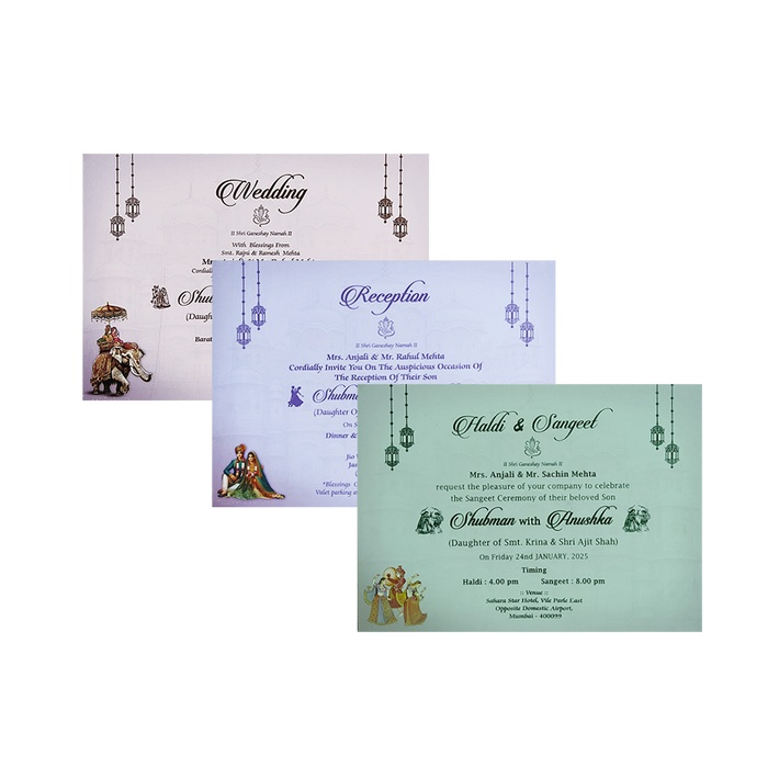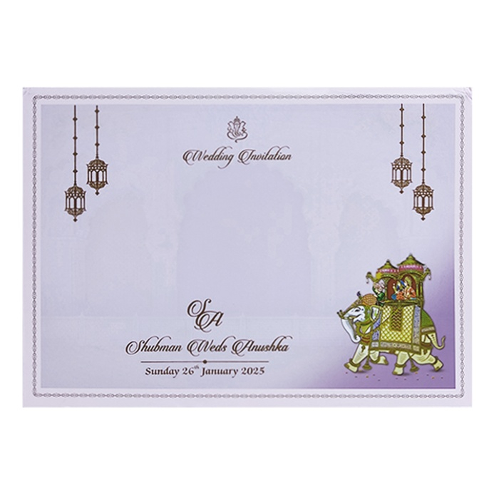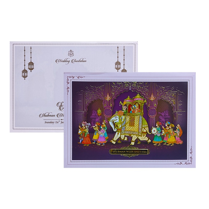 This invitation has grand royal wedding with an elegantly decorated elephant and a traditional dholi and acrylic nameplate. It includes three inserts and envelope.Additional Information