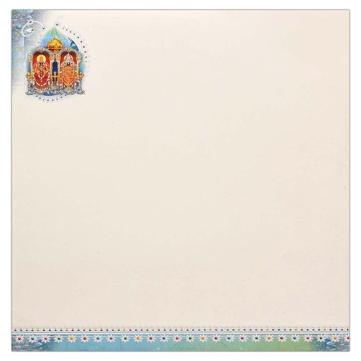 Bright and happy colours have been used to create images of Balaji Alamelu and lord Ganesha in this card. The backgrounds in soothing hues of marine blue, green and white are very calming and enhance the contrasting quality of the images. A knot signifying holy union is depicted with the auspicious images of the deities. This card is apt as an invite to Wedding, reception and engagement ceremonies. We bring out the best of the vivid colours by printing them in our in-house printing facility and also entertain your request for extra leaflets to be inserted for programme details.Additional Information