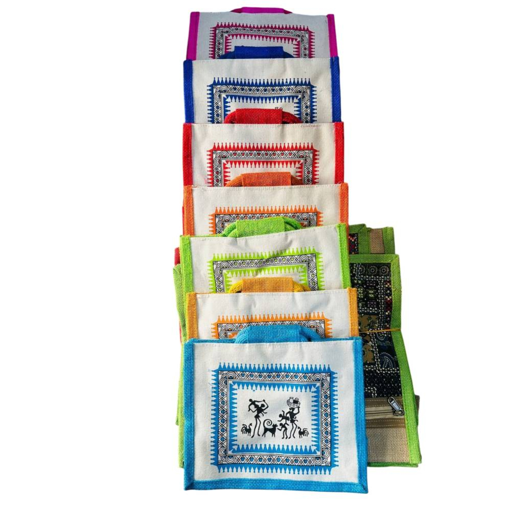 Celebrate your wedding or special occasion with the Adivasi Jute Bag – Velcro Edition. Crafted from eco‑friendly jute and inspired by tribal art, each bag features traditional Adivasi or Warli motifs. It includes a velcro closure and sturdy rope handles, offering both style and practicality. Ideal for return gifts, favors, or keepsakes, this durable, biodegradable bag blends cultural elegance with sustainability.