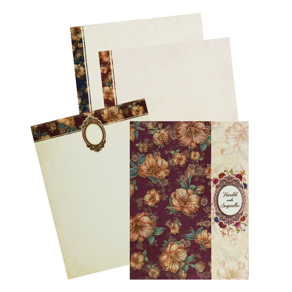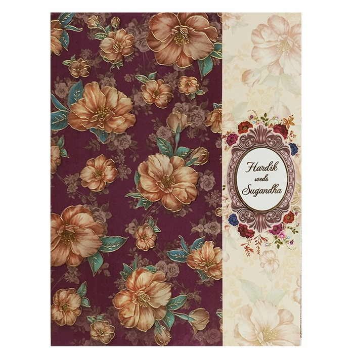 This maroon padded door card has beautiful floral design contrast colour on main card with gold foiled names print. It includes three inserts and box envelope.Additional Information