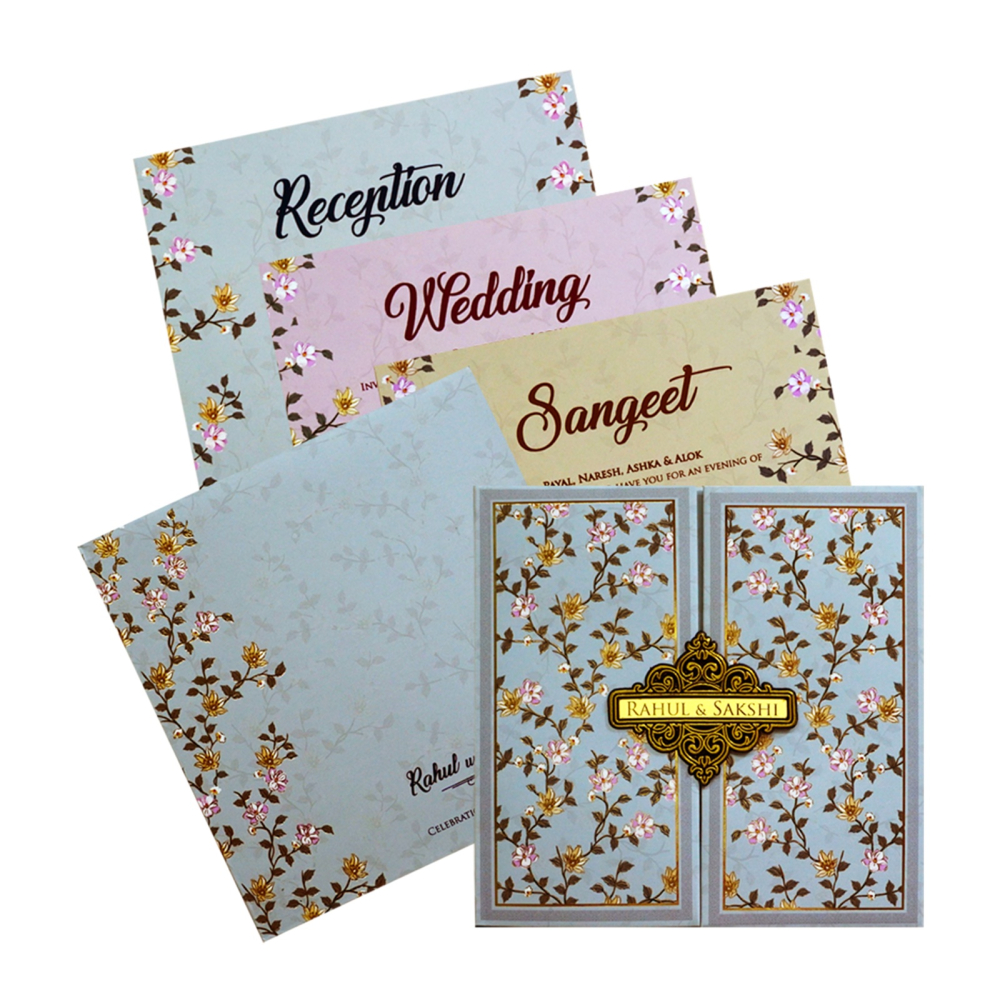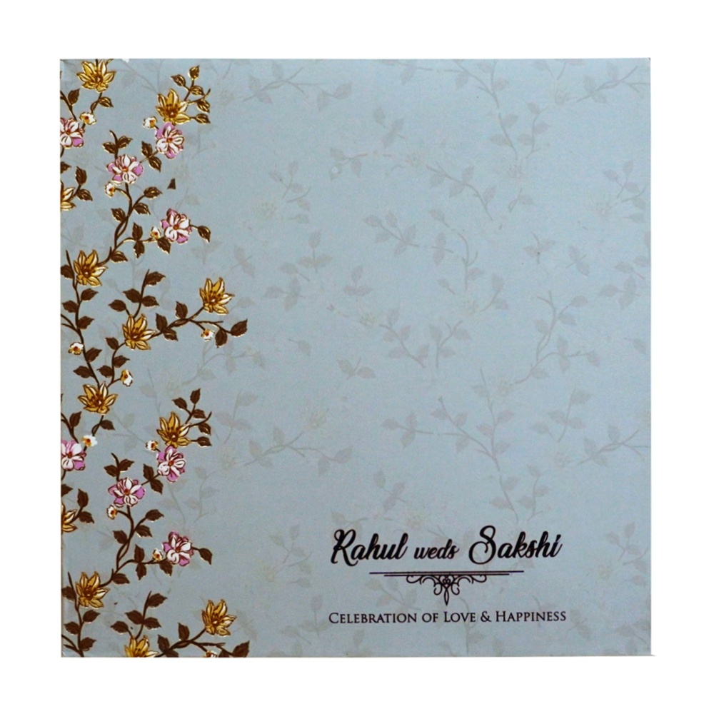 Greyish Blue padded invitation features floral embossed gold foiled design. This invitation includes three colourful inserts and it comes with acrylic nameplate.Additional Information
