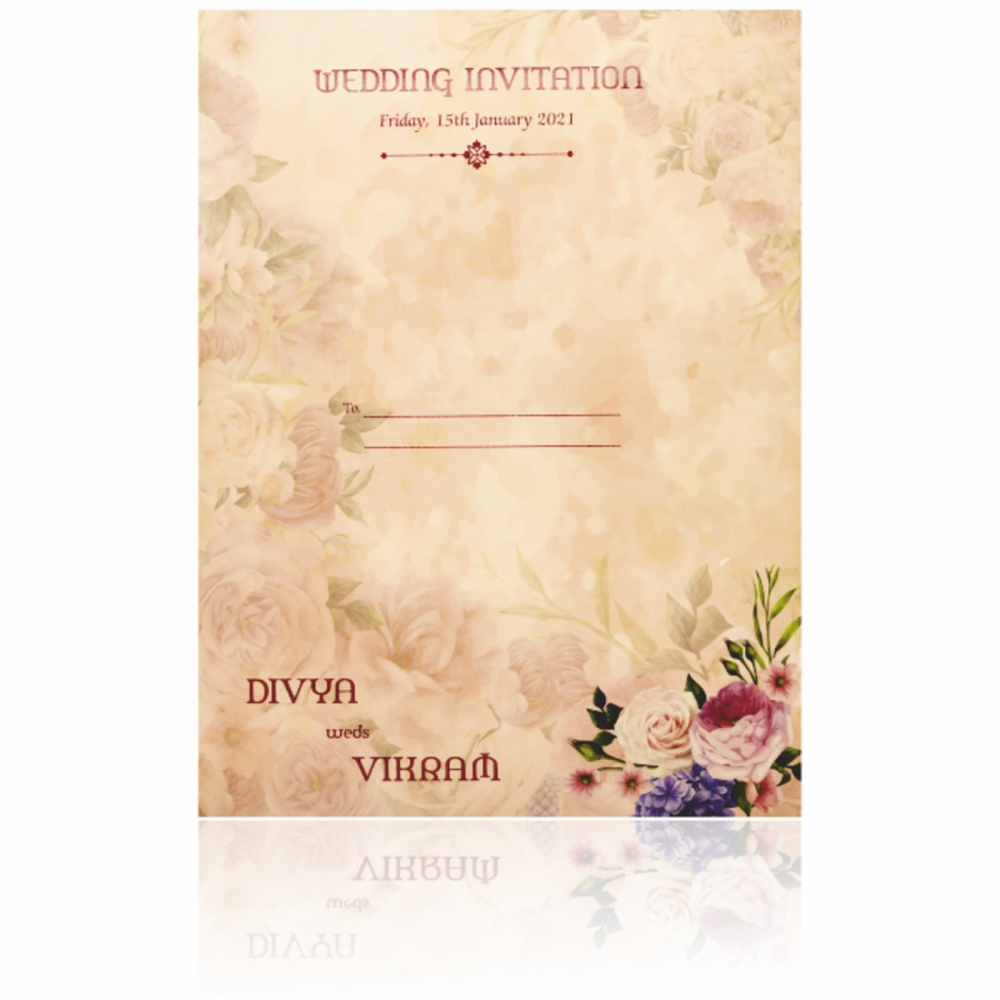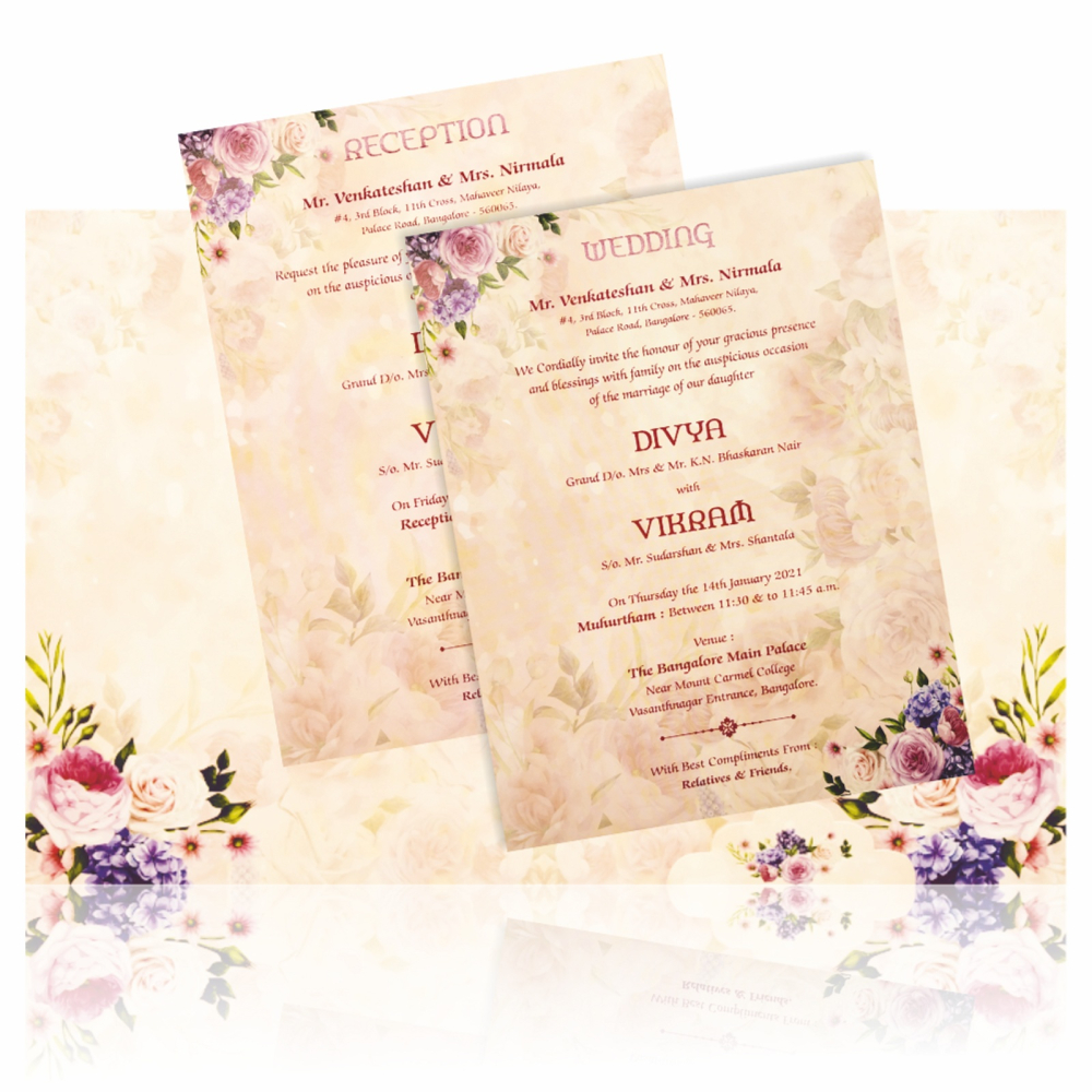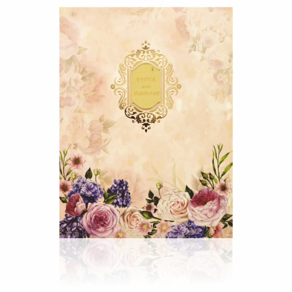 Pink personal invitation p with floral print at the borders in gold foiling.Additional Information