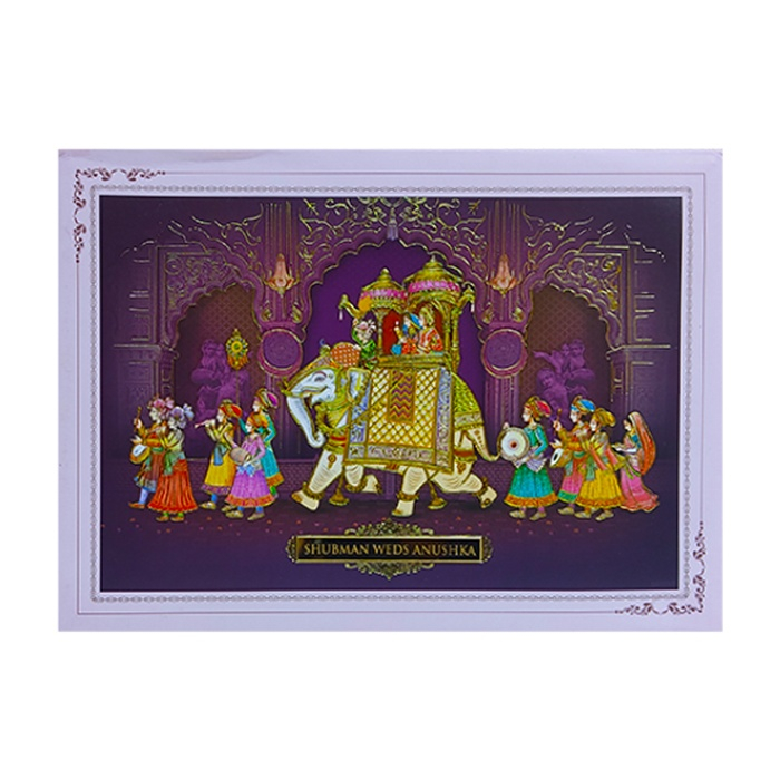This invitation has grand royal wedding with an elegantly decorated elephant and a traditional dholi and acrylic nameplate. It includes three inserts and envelope.Additional Information
